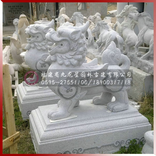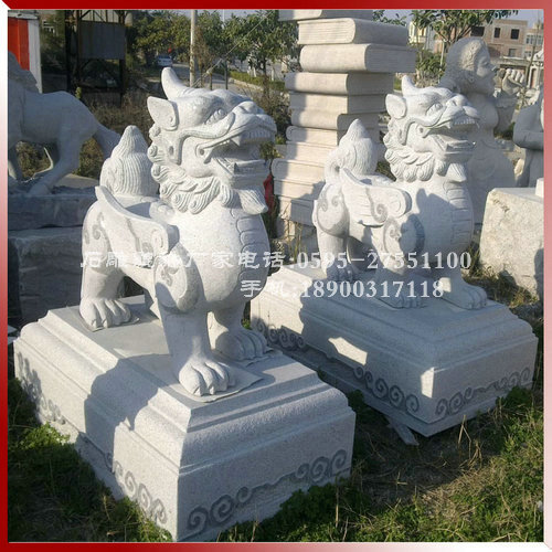 石雕貔貅一般使用各色的大理石制作雕刻而成,目前比較常見的諸如漢白玉、晚霞紅、青石等幾種大理石,并有其他各色的花崗巖石材,雕刻出來以后非常的有氣勢(shì),威武霸氣,各種顏色的貔貅均有著不同的視覺效果表現(xiàn),配以周邊的建筑,非常的大方美觀。