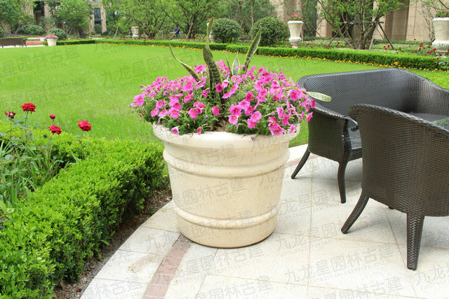 九龍星園林古建打造的石材花缽不僅僅只是一個花缽,更是兼?zhèn)淞擞^賞藝術的功能。