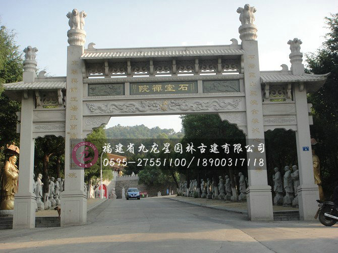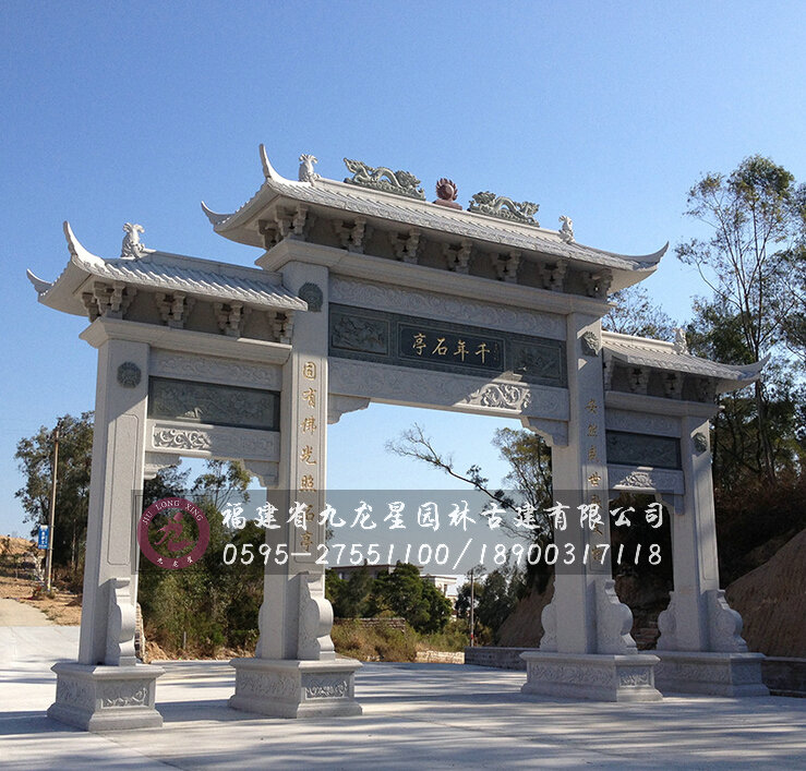 石雕牌坊即石頭修建的牌坊,是一種裝飾建筑物,也是雕刻藝術(shù)的一種。常見于古代陵園,如北京明代陵墓外面的大紅門前,有石牌坊一座,整個(gè)牌坊為五間六柱十一樓,結(jié)構(gòu)勻稱和諧,造型美觀大方?,F(xiàn)代石牌坊常用于村鎮(zhèn)入口,寺廟景區(qū)入口等。主要作為標(biāo)志性的裝飾建筑物,在設(shè)計(jì)上也沒有古建石雕牌坊那么講究。