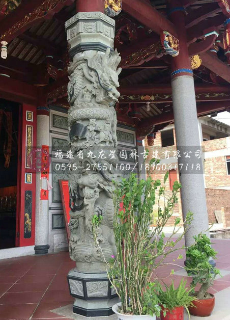 青石龍柱自清代以后大量出現(xiàn),因青石“韌”,宜精雕細(xì)刻。若按鏤雕深淺計(jì)算,具體可分為蟠龍柱、人物柱、花幕柱、八仙柱等;龍柱則又有淺浮雕與高浮雕之別,“白龍”柱基本是淺浮雕,而“青龍”基本是透析度極高的高浮雕。在龍的數(shù)量上區(qū)分,有單龍的盤(pán)繞柱,雙龍戲珠的柱子。而最為別致的是,“福龍”系列中聚成了閩南石雕龍柱的靈魂、寄托閩南人民的希望的“翻天覆地龍柱”。此外,可以按石柱本身的形狀分為方柱、八棱柱、六棱柱等等。