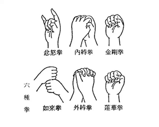 六拳包括金剛?cè)?、蓮華拳、內(nèi)縛拳、外縛拳、如來拳、忿怒拳。