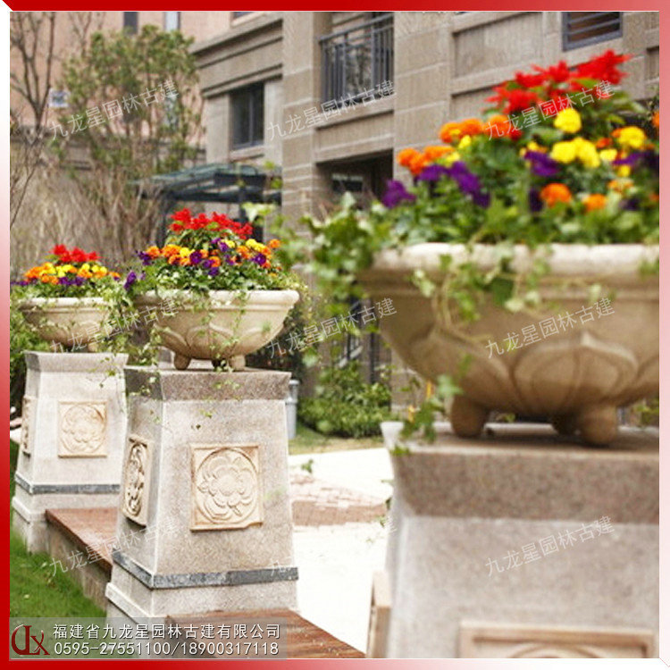 福建石材花缽批發(fā)-九龍星園林古建。石材花缽靈活多樣,隨處可用,尤其對(duì)于城鄉(xiāng)建筑比較密集和其他一些難于綠化地區(qū)的美化,有著特殊的意義。石材花缽的擺放可根據(jù)缽、盆樣式、大小的不同,進(jìn)行多種多樣的藝術(shù)組合。組合的形式可以是幾何式、自然式、混合式、集中布置、散置等,具體布局形式可根據(jù)要美化地點(diǎn)的情況決定。在較寬敞的地方,如廠前區(qū)、廣場(chǎng)、大型建筑門(mén)前、道路交叉口、停車(chē)場(chǎng)等處,石材花缽可布置為樣式多變、五彩繽紛的小花壇,在商店、住宅的門(mén)前亦可隨機(jī)點(diǎn)綴一二。