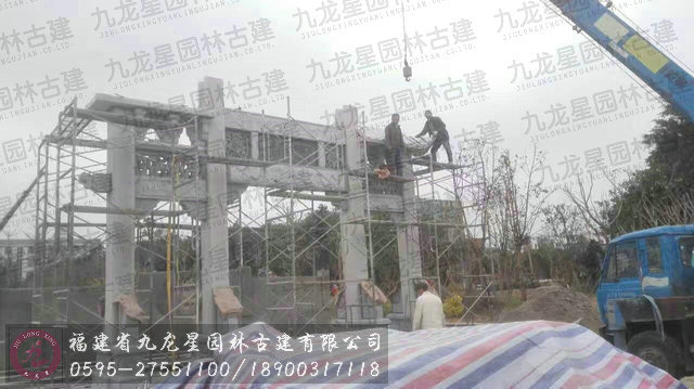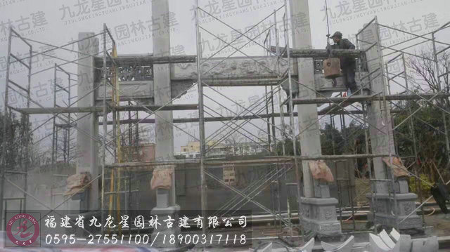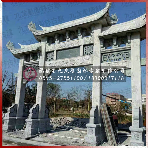 石雕牌樓材質(zhì)用料:石鼓、柱座石材G654#;窗花、花托、石拱青石;主體結(jié)構(gòu)石材G606#