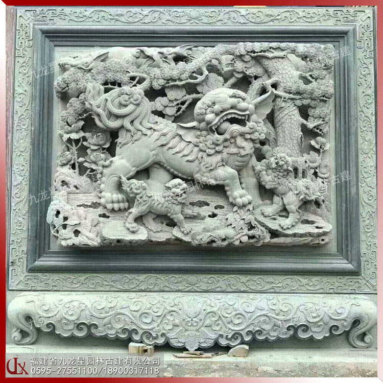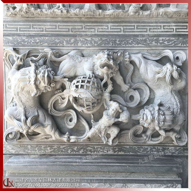 獅子滾繡球 青石浮雕獅堵圖片 寺廟浮雕壁畫(huà)制作
